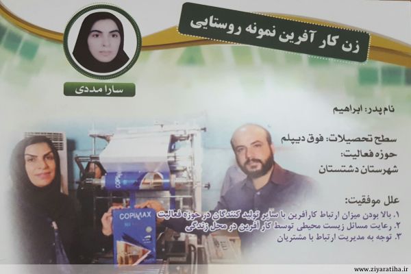 در پی تاسیس شرکت زرین برگ خلیج فارس توسط خانم مددی در روستای زیارت دشتستان در راستای رفع نیاز استان بوشهر از واردات کاغذ و صادرات به سایر استانها با بهره گیری از دانش روز، دستگاه های مدرن و خودکار و اشتغال تعداد پنج نفر بصورت مستقیم و به دلیل بازار بسیار مناسب محصولات این شرکت و مصرفی بودن کالای آن که قشر زیادی را بطور غیر مستقیم جذب بازار کار کرده است و همچنین همت و پشتکارش در تحقق این مهم ،ایشان زن کار آفرین نمونه استان انتخاب گردید .